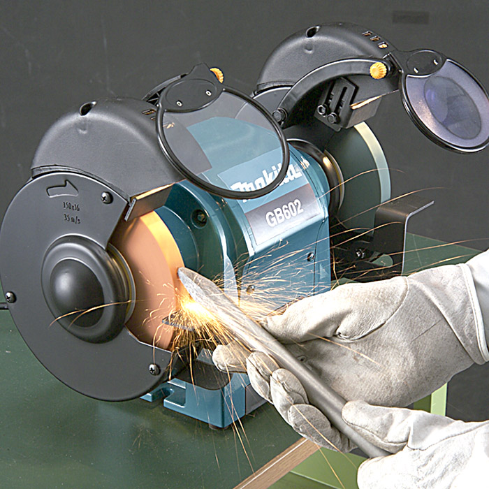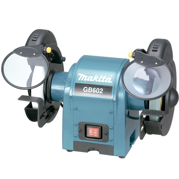 Esmeriladora de Banco de 150 mm (6"), 250 W Makita. Mantenimiento estable de herramientas con esta máquina liviana pero de rendimiento estable. Las cubiertas de las muelas tienen luces de trabajo incorporadas. Se incorpora una función de aumento en uno de los protectores oculares para trabajos de precisión. El motor es del tipo de capacitor dividido, lo que resulta en una mayor eficiencia con reducción de ruido y vibración. Los soportes de trabajo hacen su trabajo más cómodo.