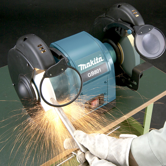 Esmeriladora de Banco de 205 mm (8"), 550 W Makita. Mantenimiento estable de herramientas con esta máquina liviana pero de rendimiento estable. Las cubiertas de las muelas tienen luces de trabajo incorporadas. Una función de balance de muela ajustable reduce la vibración al mínimo. Se incorpora una función de aumento en uno de los protectores oculares para trabajos de precisión. El motor es del tipo de capacitor dividido, lo que resulta en una mayor eficiencia con reducción de ruido y vibración. Los soportes de trabajo hacen su trabajo más cómodo.