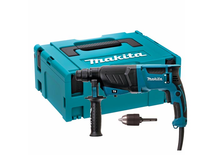 Rotomartillo Combinado de 26 mm (1"), 2.4 J, SDS-PLUS Makita. Palanca de modo de trabajo reubicada para mayor protección y durabilidad; permite que el interruptor gire tanto a la izquierda como a la derecha. Guía de broca mejorada para una mayor estabilidad de la broca durante las aplicaciones de perforación y mango de fácil agarre que proporciona el máximo empuje de potencia y un agarre seguro y cómodo en cualquier operación; aplicación por encima de la cabeza, perforación con agarre de palma hacia arriba o hacia abajo. Diseño Compacto y Liviano obtenido al minimizar el peso del motor, con una estructura de herramienta de nuevo diseño. Potente motor de 800 W que entrega 2.4 J de energía de impacto para manejar las aplicaciones más exigentes. Operación de 3 Modos para "Solo Rotación", "Martilleo con Rotación" o "Solo Martilleo" y 40 ajustes de ángulo de la Broca que permiten fijarla en posiciones óptimas. Mandril de cambio rápido.