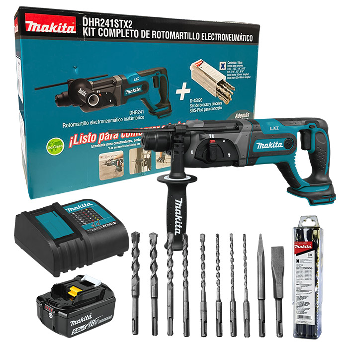 El Rotomartillo Inalámbrico SDS-Plus de 7/8” y 18V LXT® con Iones de Litio de Makita ofrece una perforación de percusión más rápida y eficiente en el lugar de trabajo. El versátil DHR241 tiene una operación de 3 modos con un diseño más compacto y un mango amortiguador que protege la carcasa de la batería para una mayor durabilidad. El embrague incorporado está diseñado para reducir el daño a los engranajes, desacoplándolos automáticamente si la broca se atasca.
